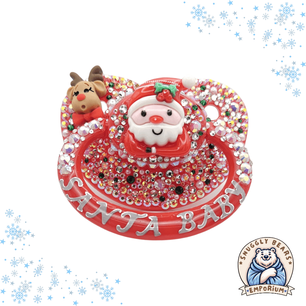 Bring the holiday cheer into your little space with the "Santa Baby" adult pacifier, a charming addition to any ABDL collection. This festive pacifier features a delightful design with a bright red base adorned with the words "Santa Baby" in playful, crisp lettering. The centerpiece is a joyous Santa face, complete with a holly-adorned hat, surrounded by a sparkling array of colorful rhinestones that shimmer like fresh snow. A cute reindeer peeks over the top, adding an extra touch of whimsy. This pacifier is not only a fun accessory for the holiday season but also crafted for comfort with a durable, adult-sized silicone nipple. Perfect for nighttime comfort or as a cute accessory for holiday-themed gatherings, this "Santa Baby" pacifier is sure to fill your festive season with smiles and joy!